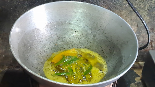 2. Add some mustard oil and when it is heated add two bay leaves and sugar, fry them with the oil.